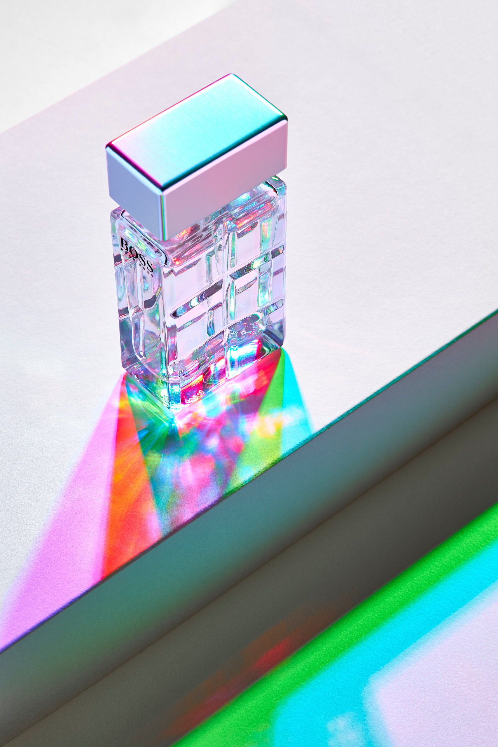 Der Untergrund auf dem ich die Parfümflakons stellte war weiß. Somit konnte der bunte Schatten seine volle Wirkung entfalteten. Ich verwendete ebenfalls weiße kubische Formen, um mehr Schattenspiele zu erzeugen.